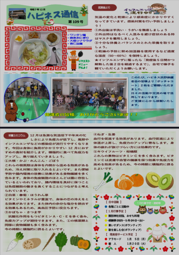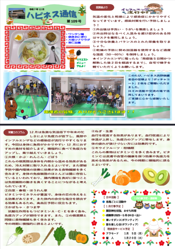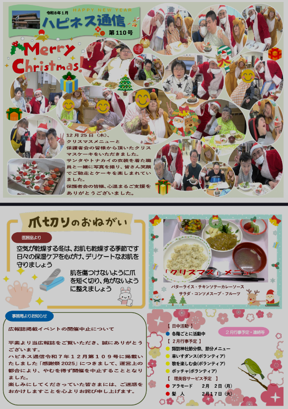 ハピネス通信について 広報紙「ハピネス通信」は毎月発行しています。私たちの施設での日々の活動やイベント、利用者の皆さんの笑顔や生活の様子をお届けすることで、施設の雰囲気や取り組みをより身近に感じていただけるよう努めています。ぜひ、ご一読下さい。 令和8年1月110号 令和7年12月109号 令和7年11月108号 令和7年10月107号 令和7年9月106号 令和7年8月105号 令和7年7月104号 令和7年6月103号 令和7年5月102号 令和7年4月101号 令和7年3月100号 令和7年2月99号 令和7年1月98号 令和6年12月97号 令和6年11月96号 令和6年10月95号 令和6年9月 94号 令和6年8月 93号 令和6年7月 92号 令和6年6月 91号 令和6年5月 90号 令和6年4月89号 令和6年3月 88号 令和6年2月 87号 令和6年1月 86号